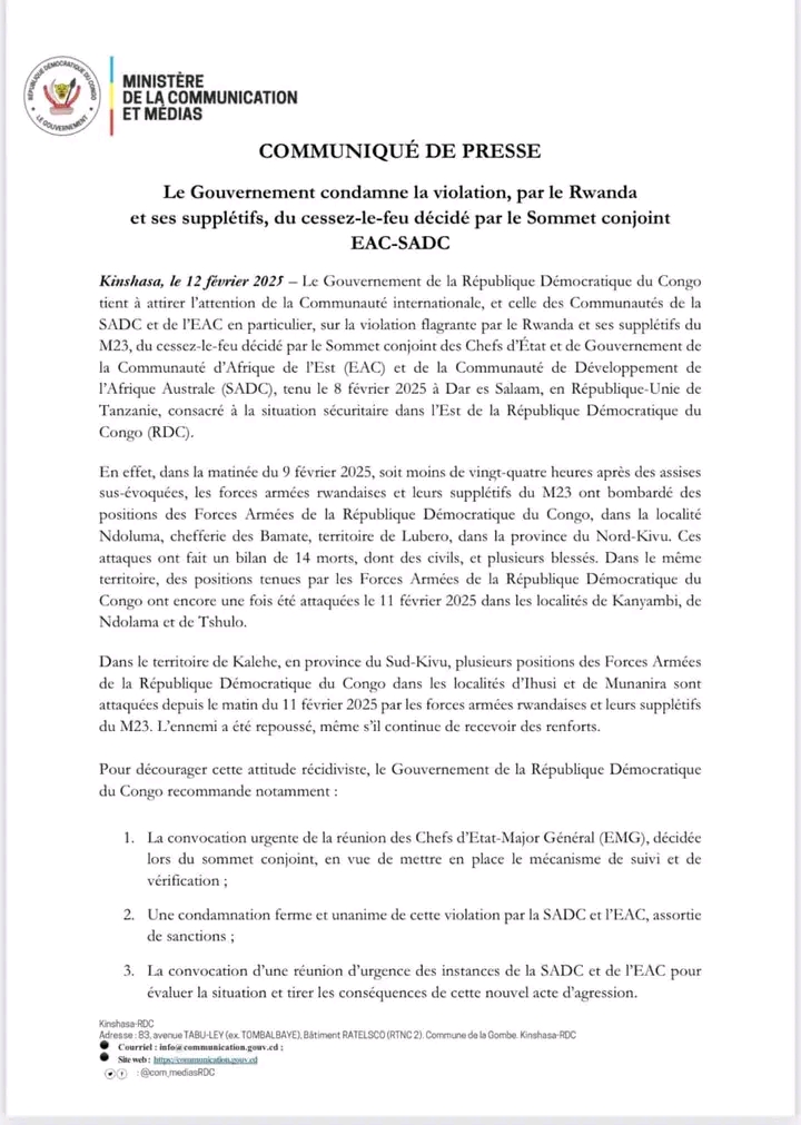 Kinshasa, le 12 février 2025 – Dans un communiqué officiel, le Gouvernement de la République Démocratique du Congo (RDC) a fermement condamné la violation du cessez-le-feu par le Rwanda et ses supplétifs du M23. Ce cessez-le-feu avait été décidé lors du sommet conjoint des chefs d’État et de gouvernement de la Communauté d’Afrique de l’Est (EAC) et de la Communauté de Développement de l’Afrique Australe (SADC), tenu le 8 février 2025 à Dar es Salaam, en Tanzanie.