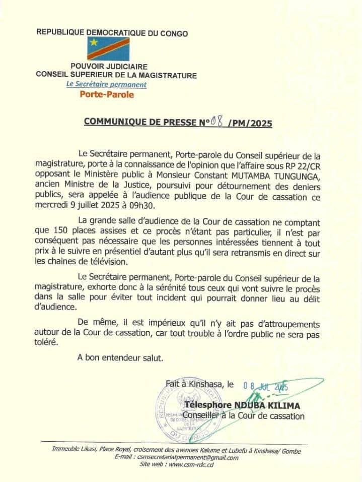 L’audience très attendue du ministre démissionnaire de la Justice, Constant Mutamba, devant la Cour de cassation, sera retransmise en direct à la télévision nationale ce mercredi 9 juillet. Une décision prise par les autorités judiciaires en vue d’assurer la transparence du processus, dans un dossier hautement médiatisé et sensible.