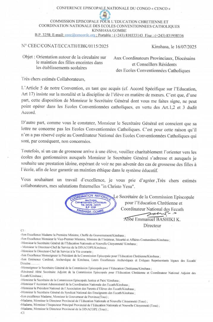 Kinshasa, 16 juillet 2025 – La circulaire émise par le Secrétariat général de l’Éducation nationale et Nouvelle Citoyenneté, relative au maintien des filles enceintes dans les établissements scolaires, ne s’appliquera pas dans les écoles conventionnées catholiques. C’est ce qu’a affirmé ce mercredi l’Abbé Emmanuel Bashiki, secrétaire de la Commission épiscopale pour l’éducation chrétienne et coordonnateur national des écoles conventionnées catholiques.