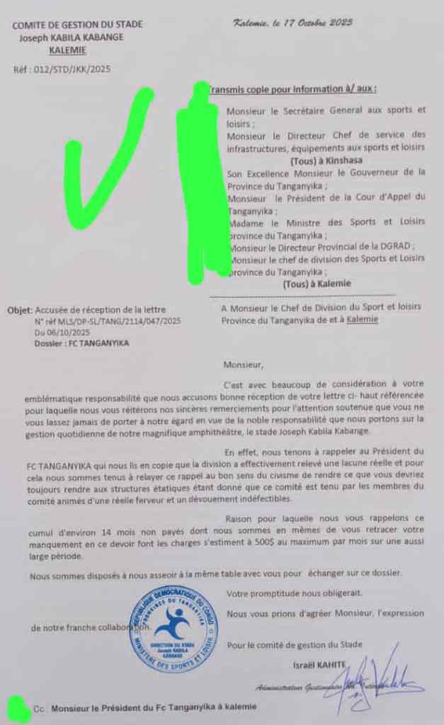 Dans une correspondance datée du 17 octobre 2025, le comité de gestion du stade JKK a rappelé au président du FC Tanganyika l’obligation de régler les frais d’occupation du stade, impayés depuis 14 mois, à raison de 500 $ par mois.