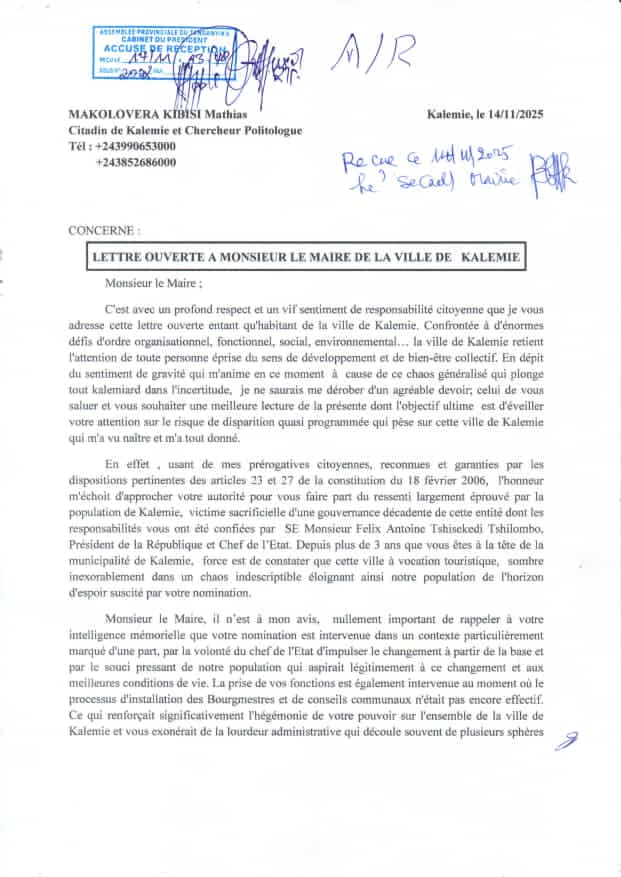 Kalemie, 14 novembre 2025 – Makolovera Kibisi Mathias, citoyen et chercheur politologue, a publié une lettre ouverte adressée au Maire de Kalemie, dans laquelle il dénonce ce qu’il qualifie de « chaos généralisé » et de « risque de disparition quasi programmée » de la ville. Il affirme s’exprimer en tant que citoyen pour relayer « le ressenti largement partagé par la population », qui ferait face, selon lui, à une gouvernance défaillante.