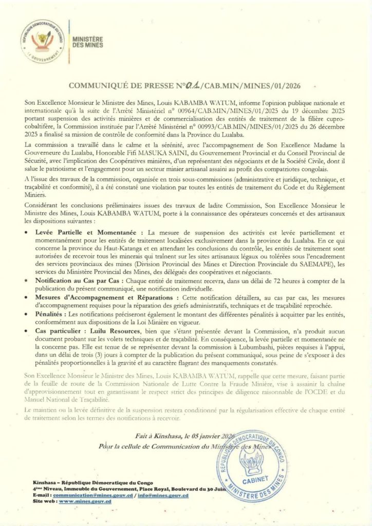 Le ministre des Mines, Louis Kabamba Watum, a annoncé ce lundi la levée partielle et momentanée de la suspension des entités de traitement et de commercialisation du cuivre et du cobalt dans la province du Lualaba.