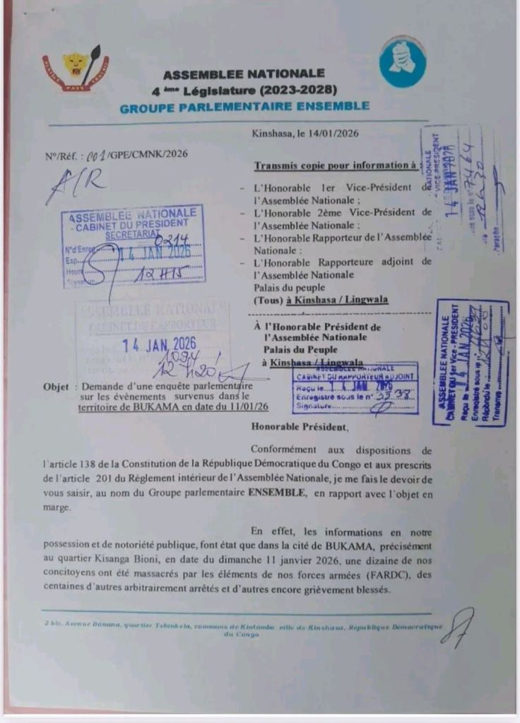 Les députés du groupe Ensemble pointent des divergences importantes entre les versions officielles et les faits rapportés sur le terrain, et estiment qu’il est urgent de faire toute la lumière sur ces événements. Ils appellent à une enquête indépendante, impartiale et rapide, afin d’établir les responsabilités et rétablir la confiance entre la population et les forces de sécurité.Le président de l’Assemblée nationale est désormais appelé à se prononcer sur cette demande qui pourrait, si acceptée, ouvrir la voie à des auditions et descentes parlementaires à Bukama dans les prochains jours.