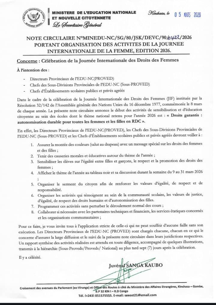 Le ministère de l’Éducation nationale et Nouvelle Citoyenneté de la République démocratique du Congo a publié, le 5 mars 2026 à Kinshasa, une note circulaire annonçant l’organisation d’activités dans les établissements scolaires à l’occasion de la Journée internationale des droits des femmes, célébrée chaque 8 mars.